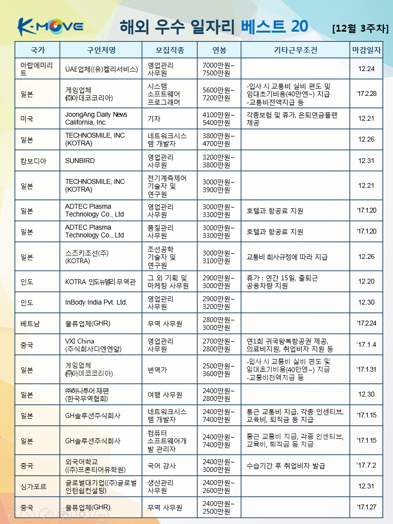 ‘월드잡플러스 12월 3주차 해외우수일자리 베스트20 선정 결과’